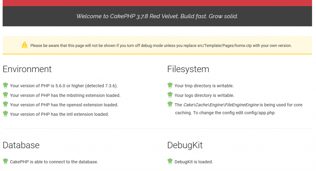 「https://(サーバーのURL)/」にアクセスして、スタートページのDatabaseの項目が「CakePHP is able to connect to the database.」に変わったことを確認して、CakePHP3.7のインストールを完了しました。